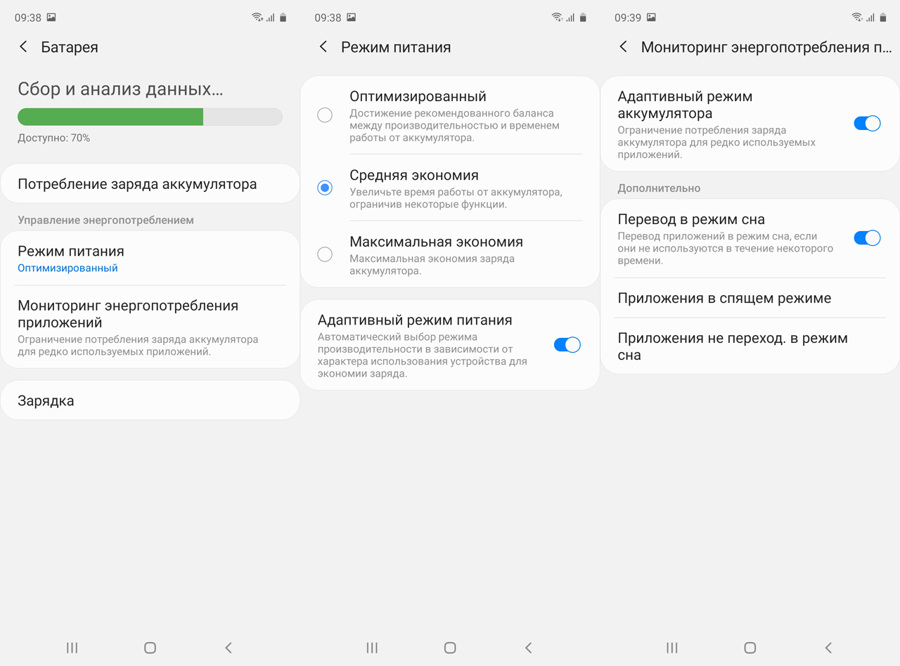 В настройках «Батареи» можно найти ряд соответствующих опций, которые помогают увеличить время автономной работы девайса. Так, в зависимости от типа предполагаемой нагрузки, можно выбрать несколько режимов: «Оптимизированный», «Средняя экономия», «Максимальная экономия», или автоматизировать свой выбор, воспользовавшись адаптивным режимом.