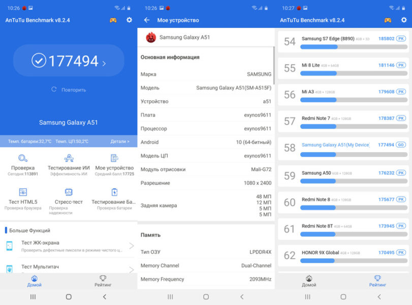 Результаты тестирования производительности Samsung Galaxy A51 в AnTuTu: