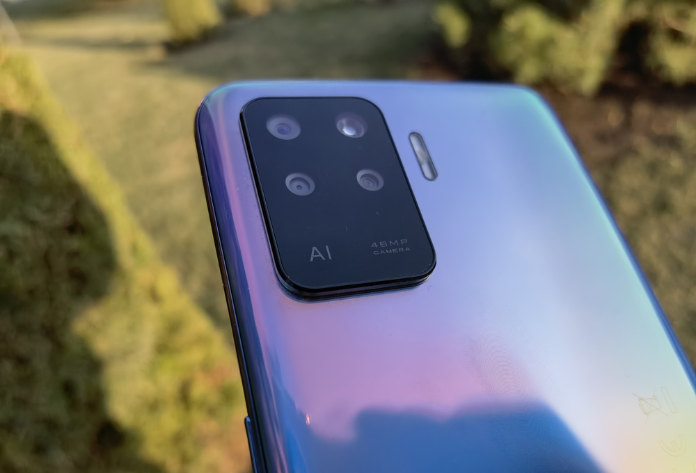 На задней панели вверху слева расположен прямоугольник с четырьмя камерами и красноречивой надписью AI, а с правой стороны есть продольная светодиодная полоса. Да, островок камеры несколько выступает над корпусом, но не очень, поэтому любой чехол, даже тот, что в комплекте, почти нивелирует это. Внизу логотип компании OPPO и все. Все остальное — невероятный цвет и его оттенки.