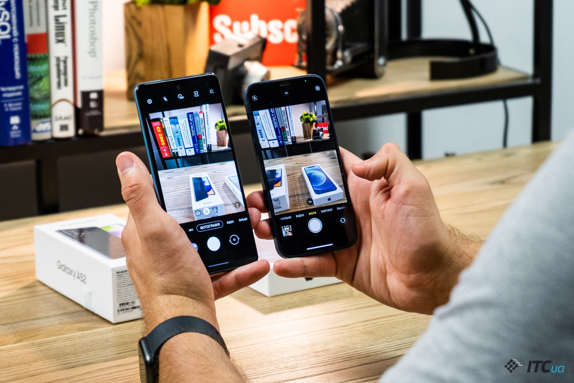 Набор камер в аппаратах тоже отличается. В iPhone 12 это два модуля: 12-мегапиксельный широкоугольный с диафрагмой f/1.6, оптической стабилизацией и поддержкой Smart HDR 3, а также 12-мегапиксельный сверхширокоугольный с диафрагмой f/2.4 и электронной стабилизацией. В Galaxy A52 сразу четыре: 64-мегапиксельный широкоугольный с диафрагмой f/1.8, фазовым автофокусом и с оптической стабилизацией; 12-мегапиксельный сверхширокоугольный с диафрагмой f/2.2 и электронной стабилизацией; 5-мегапиксельный макро с диафрагмой f/2.4; а также сенсор глубины сцены. Сразу скажу, что количество камер не главное, у Galaxy A52 на две больше, но они вспомогательные и большой роли не играют.