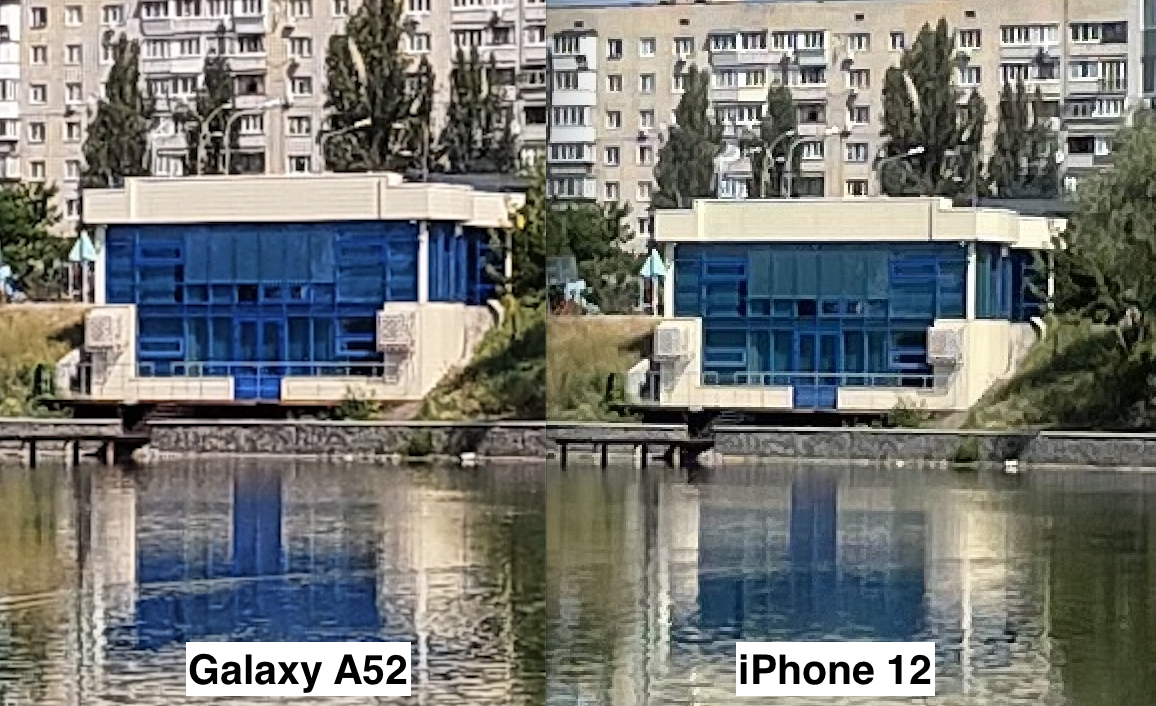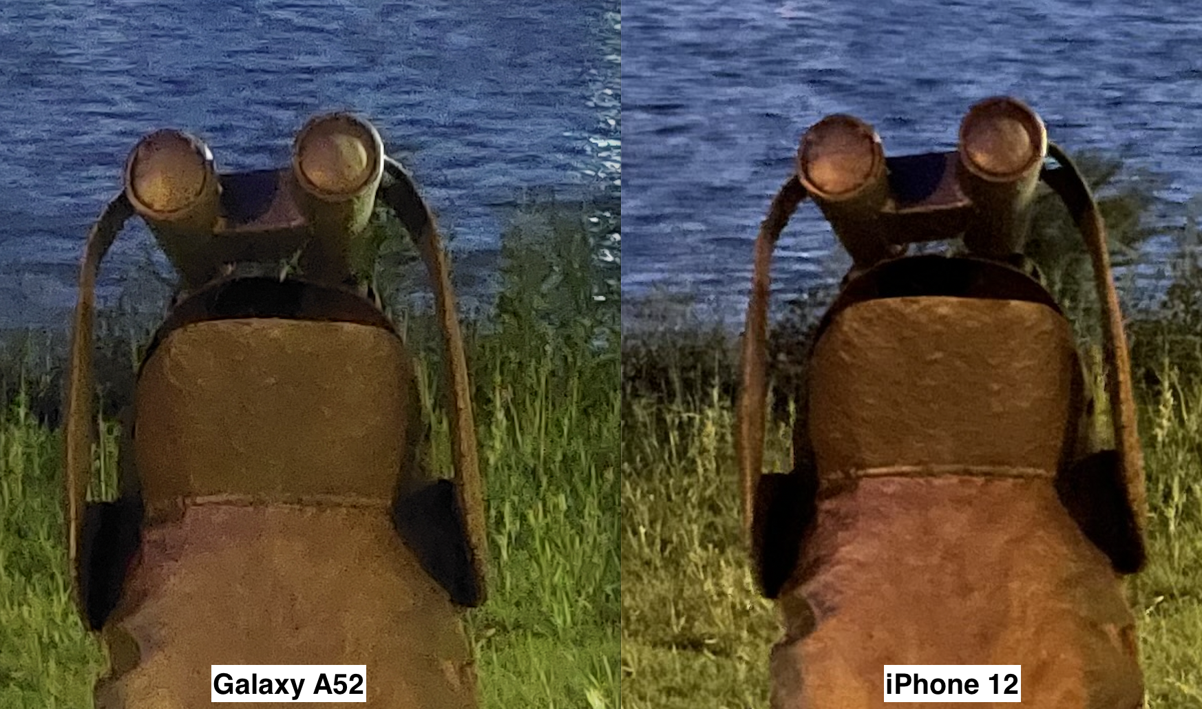 Ночью основные камеры аппаратов начинают больше полагаться на возможности процессора и постобработки. При этом у Galaxy A52 менее светосильный объектив, и более агрессивные алгоритмы, которые съедают часть деталей, но в целом как для модели среднего уровня получается достойно. Диафрагма f/1.6, мощный чип и ISP позволяют iPhone 12 захватывать больше света и мягче обрабатывать тени, но детализация здесь не сильно выше, разрешение основного модуля давно пора увеличить.