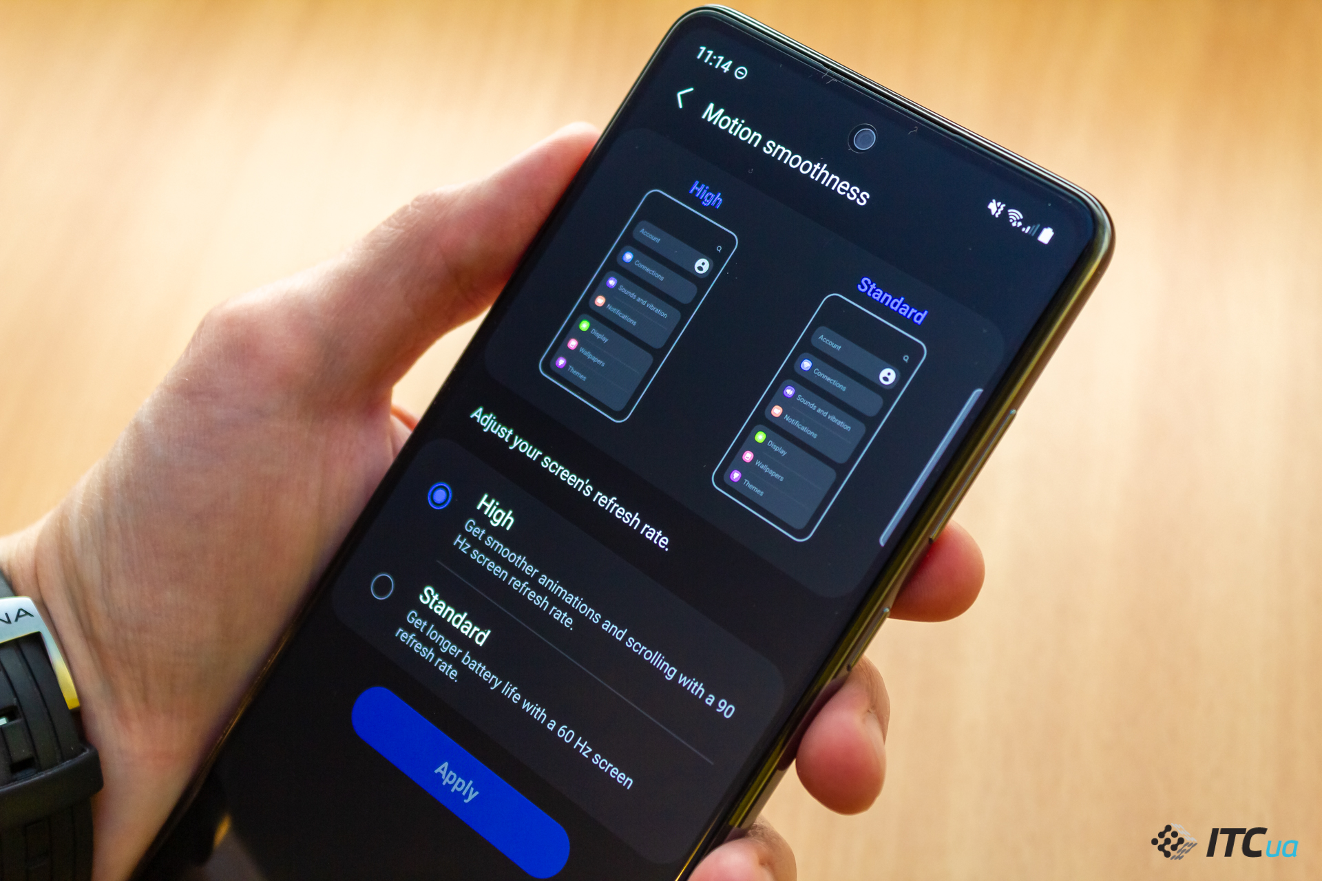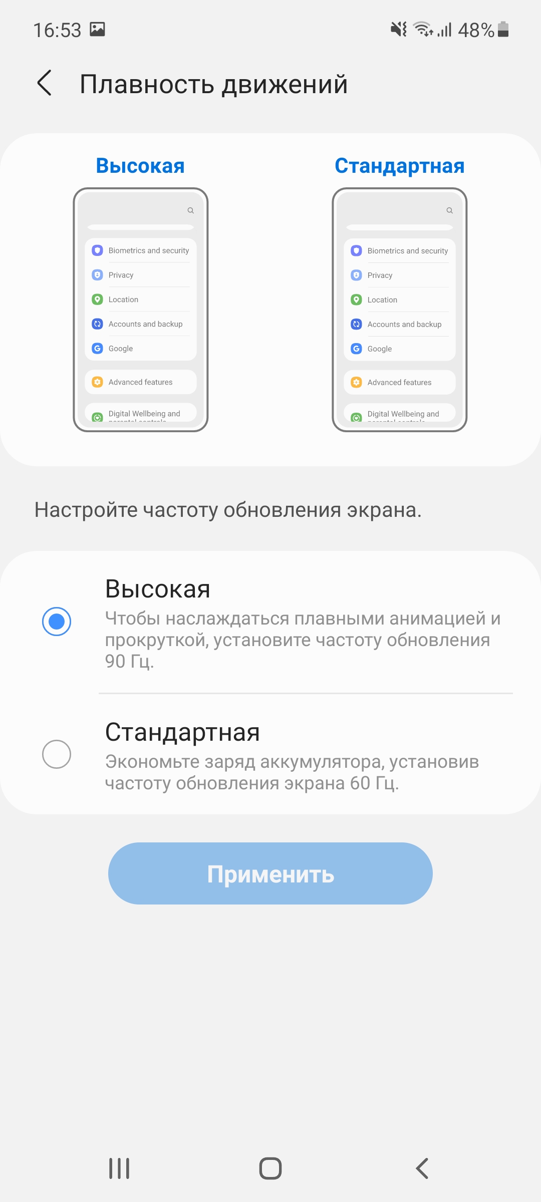 Все модели линейки Galaxy A получили дисплеи с частотой обновления 90 Гц. Это отлично влияет на плавность прокрутки страниц и на движения изображения в поддерживаемых играх. Если же пользователю это не очень принципиально, можно переключиться на стандартные 60 Гц и сэкономить условную пару процентов заряда в день.