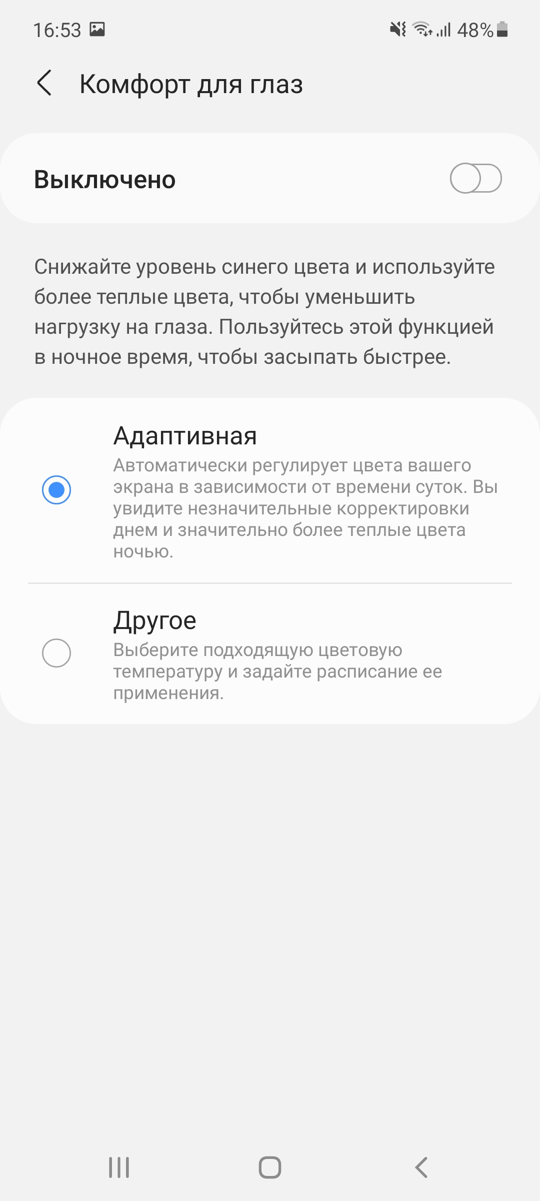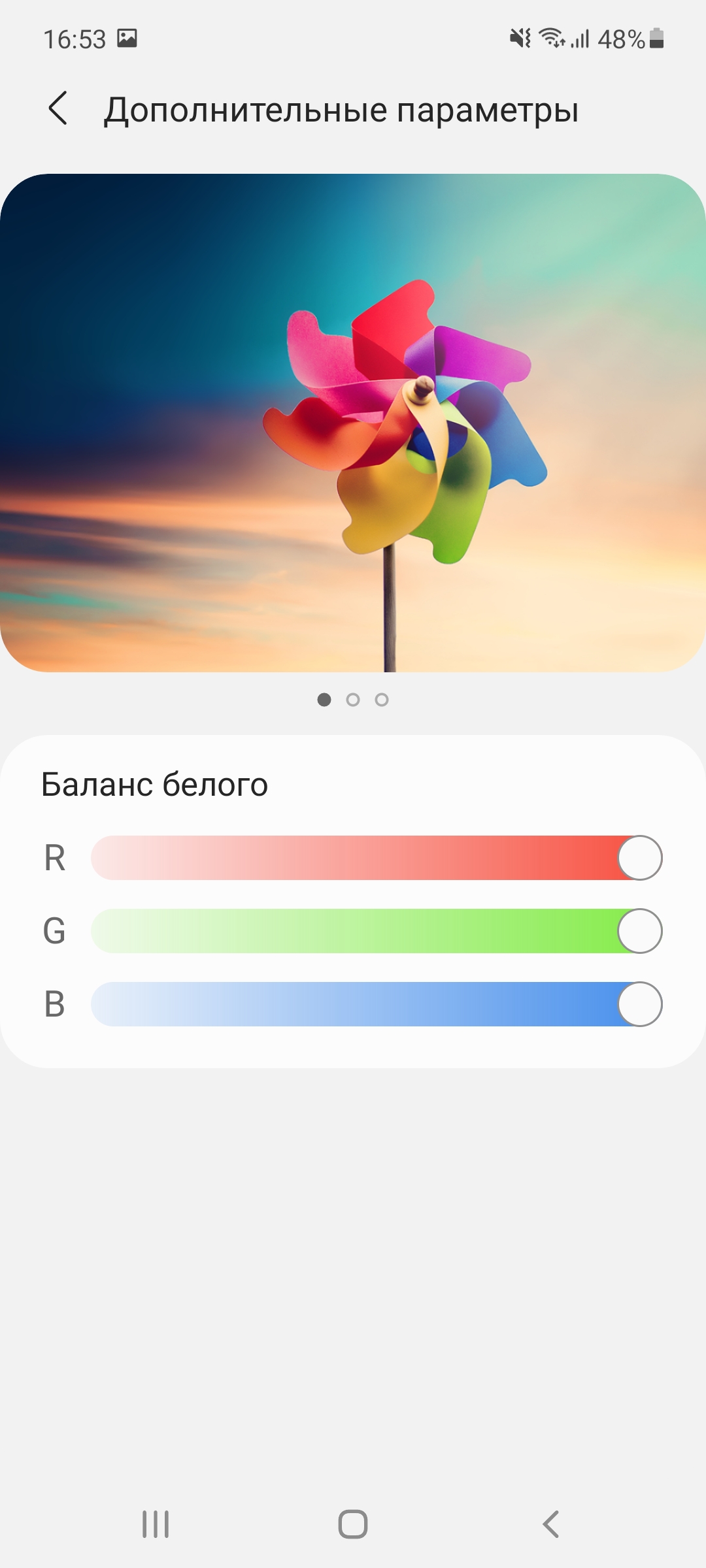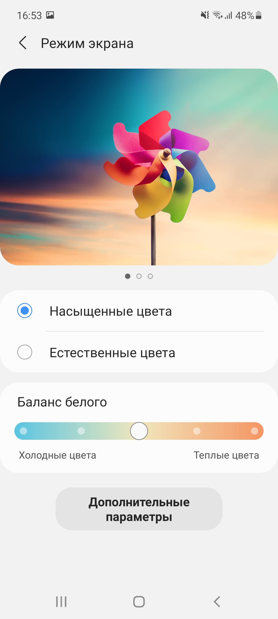 Фирменная Super AMOLED-матрица все также отлично откалибрована. Производитель пока не меняет устоявшиеся цветовые профили, где пользователю оставили выбор между Vivid (более насыщенным) и Natural. Как обычно, первый позволяет немного настроить цвета и температуру, тогда как второй такими опциями не снабжен. При этом оба выглядят хорошо и тут выбор будет зависеть только от личных предпочтений.