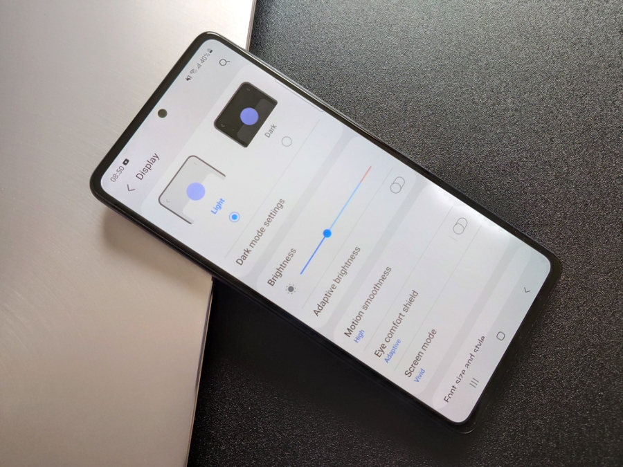 Экран действительно радует глаз и с ним приятно взаимодействовать на протяжении длительного времени. В настройках традиционно можно изменить режим цветопередачи (насыщенные или естественные цвета с регулировкой баланса белого), размер и стиль шрифта, масштаб экрана, включить повышенную или стандартную частоту обновления, режим комфорта для глаз или адаптивную яркость, выбрать темную тему, а также настроить панель Edge и AoD.
