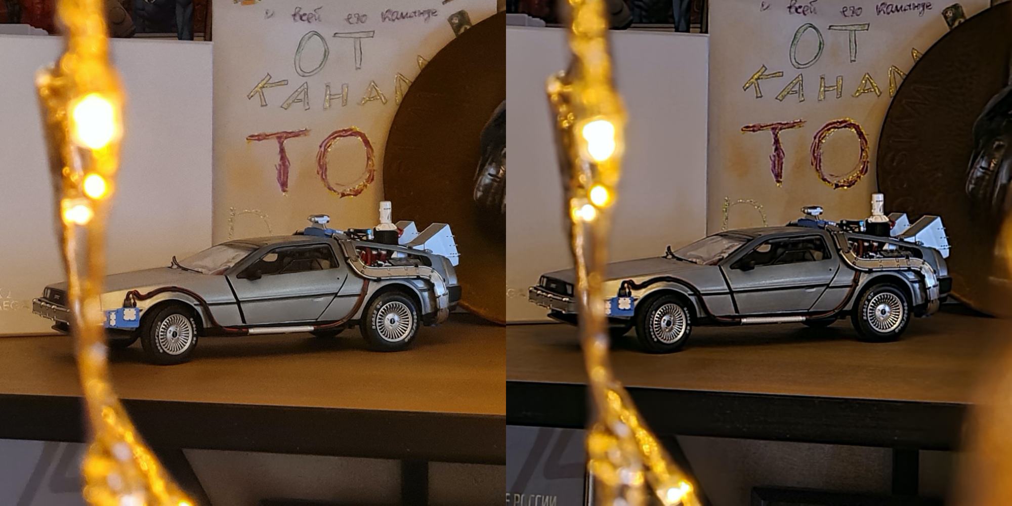 На коллаже ниже левое фото в обычном режиме, а правое — в ночном, когда телефон склеивает несколько снимков в один: