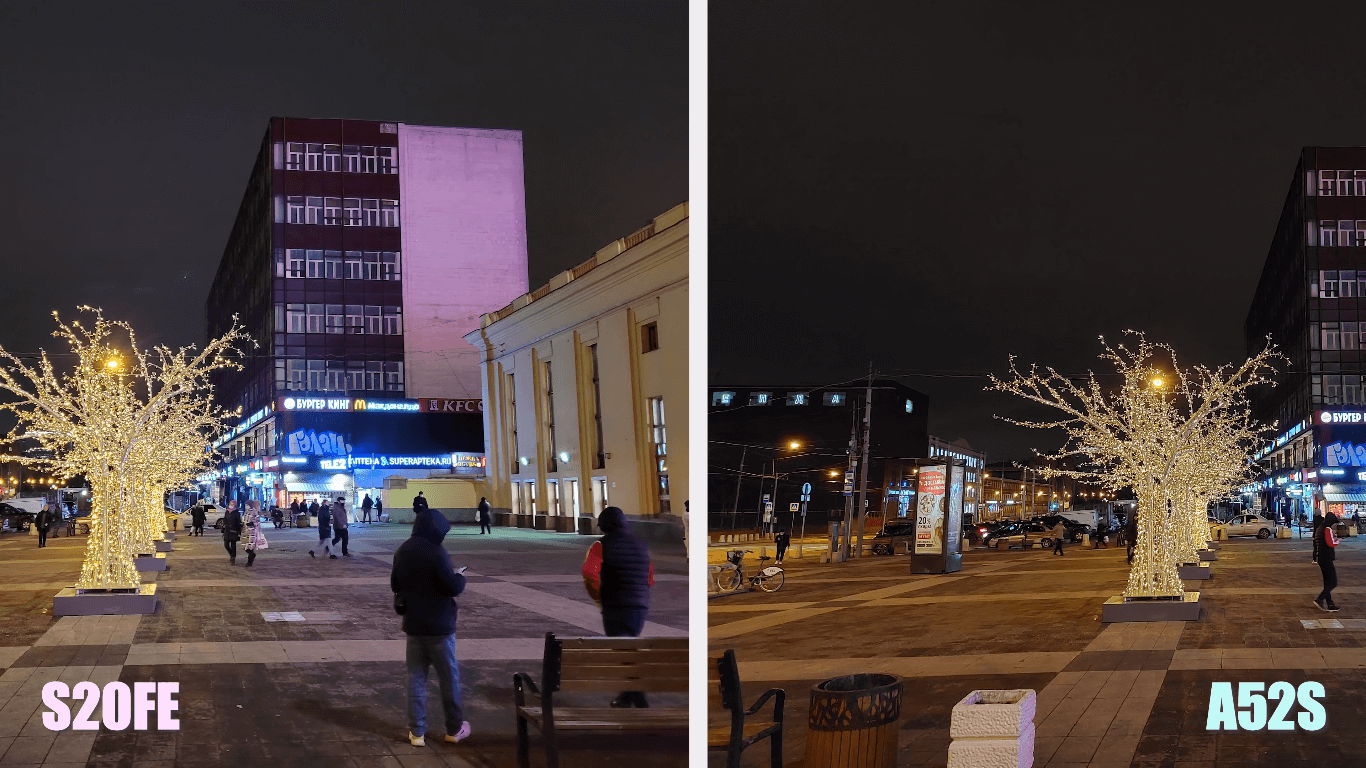 Что в Galaxy A52, что в iPhone 12 сверхширокоугольный модуль ночью можно не запускать, его не особо спасает даже «ночной режим», разве что у Apple за счет более мощной платформы получается вытянуть чуть больше света, но это не особо помогает при съемке с рук, детали снимка все-равно смазываются.