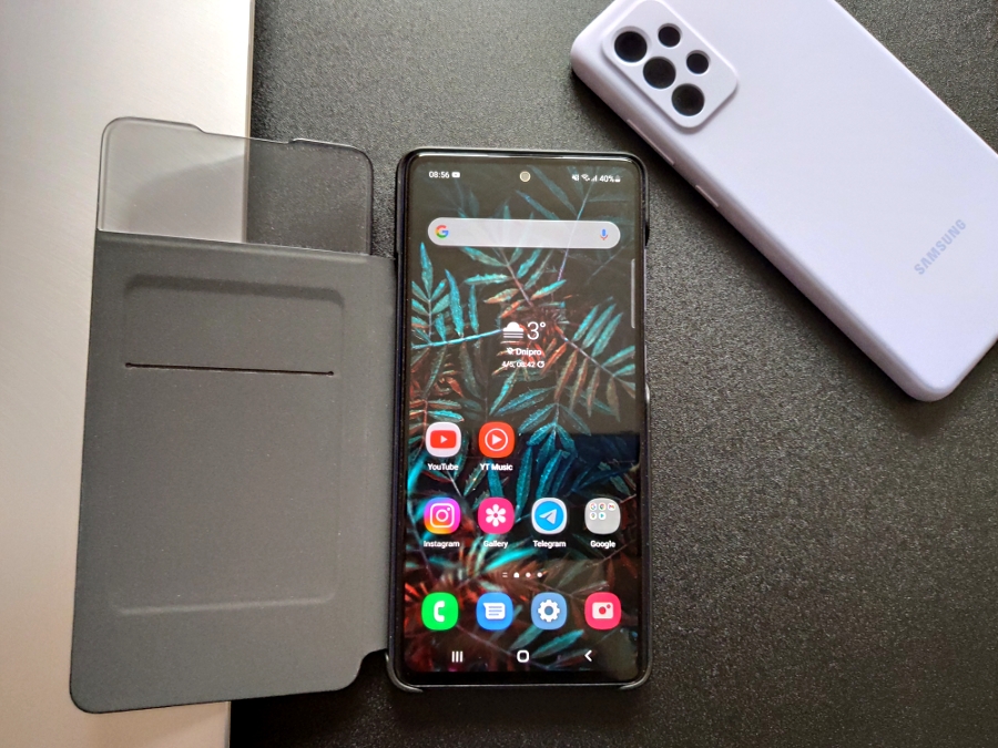 Здесь у меня есть два варианта и начну я с классического силиконового бампера Samsung Silicone Cover. По цвету он абсолютно идентичен цвету корпуса A72 (в нашем случае – пастельно-фиолетовый), силикон довольно плотный и приятный на ощупь. Цена вопроса – 779 грн или около $28. Второй – это антибактериальный чехол-книжка Smart S View Wallet Cover с магнитной фиксацией и информационным окошком для Always-On. О нем я уже подробно рассказывала в , поэтому не буду повторяться. Напомню только, что его стоимость составляет 1199 грн ($43). Не сказать, что аксессуары Samsung дешевые, но качество у них, конечно, на высшем уровне.