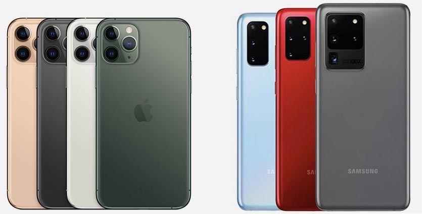 На старте продаж будут доступны три расцветки: голубая, серая и красная. Для модели S20+ вместо голубой появится черная модель. На стороне iPhone 11 Pro золотой, «серый космос», серебристый и тёмно-зелёный цвета корпуса.