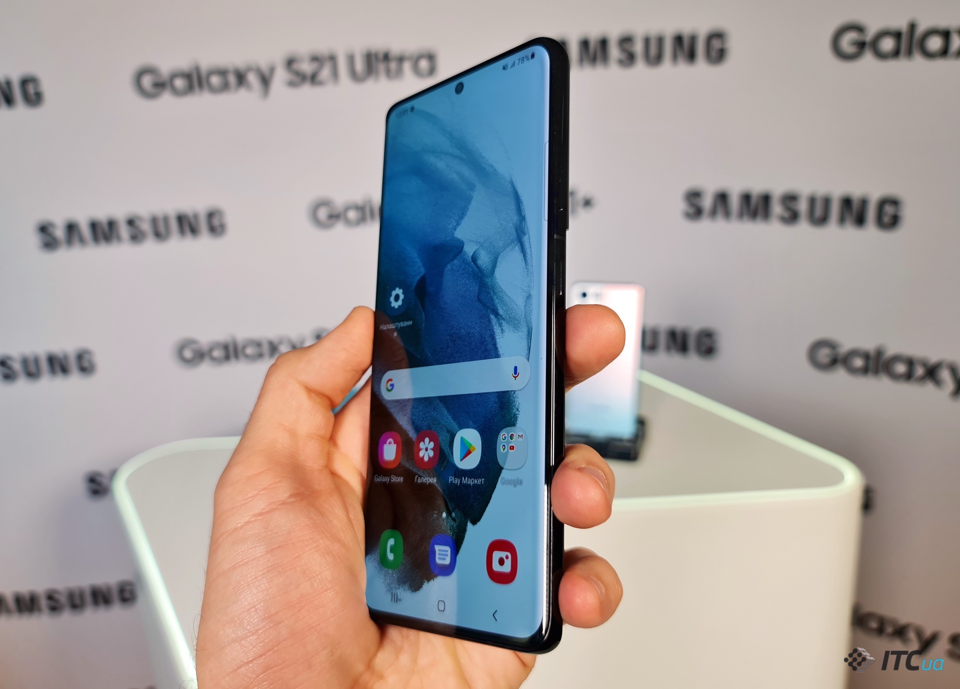 В Galaxy S21 Ultra также используется защитное стекло Gorilla Glass Victus, но на фронтальной панели оно немного закругляется по краям, на вид немного меньше, чем в Galaxy Note20 Ultra, но достаточно, чтобы выделяться на фоне младших моделей.