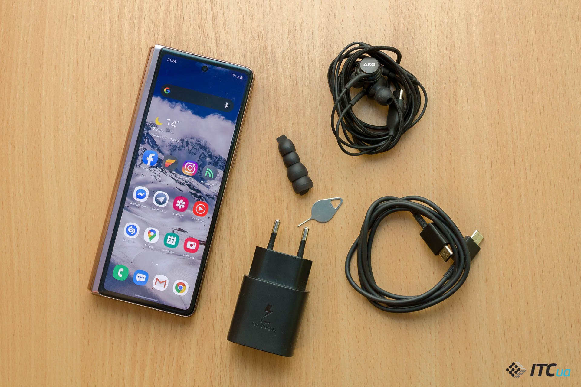 Начнем с того, что покупателю новой модели достанется слегка другой комплект, сравнительно с прошлогодним вариантом. В коробке с новинкой пользователю больше не кладут беспроводные наушники и чехол, оставив блок питания, кабель, «скрепку» и проводную гарнитуру AKG с USB-C и двумя парами амбушюр. Зато внешний дисплей защищен заводской пленкой, которая при такой модели использования, как у Fold, лишней совершенно не будет. Внутренний экран, само собой, тоже с пленкой.