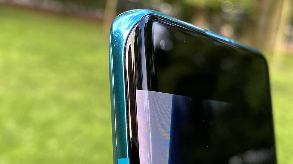 Стороны демонстрируют соотношение 19,5 к 9, а дисплей формирует почти всю фронтальную панель. Отступ от нижней грани не превышает 3,32 мм и практически не привлекает внимания. Лицевая камера располагается на фронтальной панели слева, при этом можно заметить лишь небольшой вырез с видом чёрной точки, минимально выделяющейся в визуальном оформлении устройства.