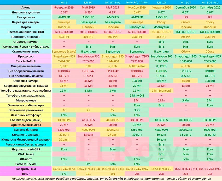Для пользователей, желающих сравнить параметры телефонов прямо сейчас, мы приведем сравнительную таблицу, причем поместим в нее информацию не только об обозреваемых моделях, но и о некоторых других смартфонах от Xiaomi. Выйдет вполне наглядное сравнение телефонов Xiaomi Mi 9, Mi 9T, Mi 9T Pro, Note 10/10 Pro, Mi 10, Mi 10T, Mi 10T Pro.