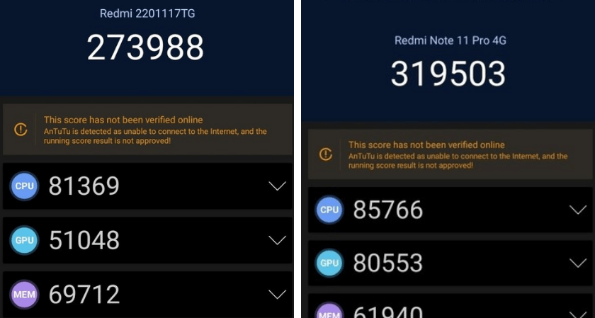 Redmi Note 11 (слева) и Redmi Note 11 Pro (справа). Результаты теста в AnTuTu.