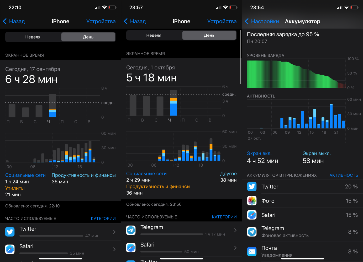 И с батареями у обоих смартфонов ситуация примерно та же. Ёмкость аккумулятора в iPhone 12 меньше, чем в iPhone 11, но как заявляет Apple, обоим заряда батареи хватает на 17 часов просмотра видео и на 65 часов прослушивания аудио. А смотреть потоковое видео на iPhone 12 на одном заряде батареи можно даже на час дольше, чем на iPhone 11: 11 часов вместо 10. Это по данным Apple. В реальности поскольку смартфон большую часть времени находится в неактивном состоянии, заряда iPhone 11 и iPhone 12 хватает на два дня.