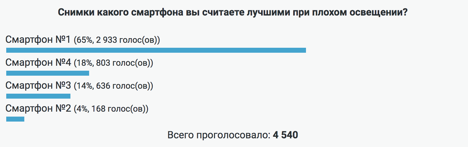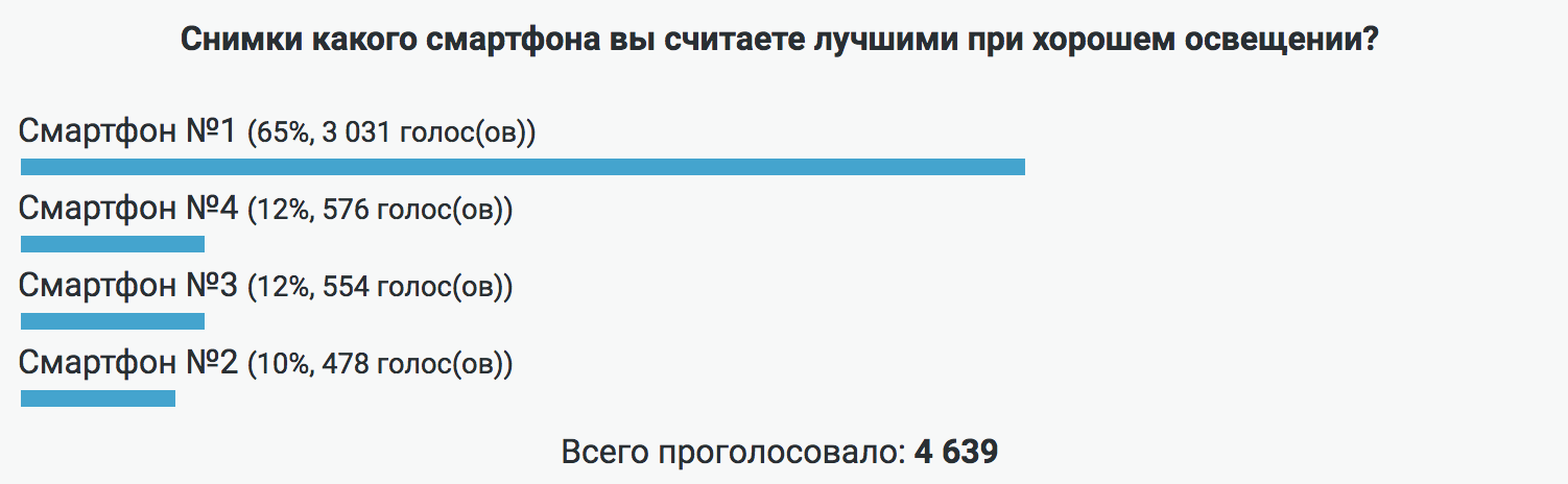Как видно, в обоих голосованиях первое место с большим отрывом занял «Смартфон №1», за ним расположился «Смартфон №4», который в дневном тесте практически разделил второе место со «Смартфоном №3», но обошёл его по ночным фото. На четвёртом месте оказался «Смартфон №2», не сильно уступая по дневным снимкам, но набрав меньше голосов по ночным.
