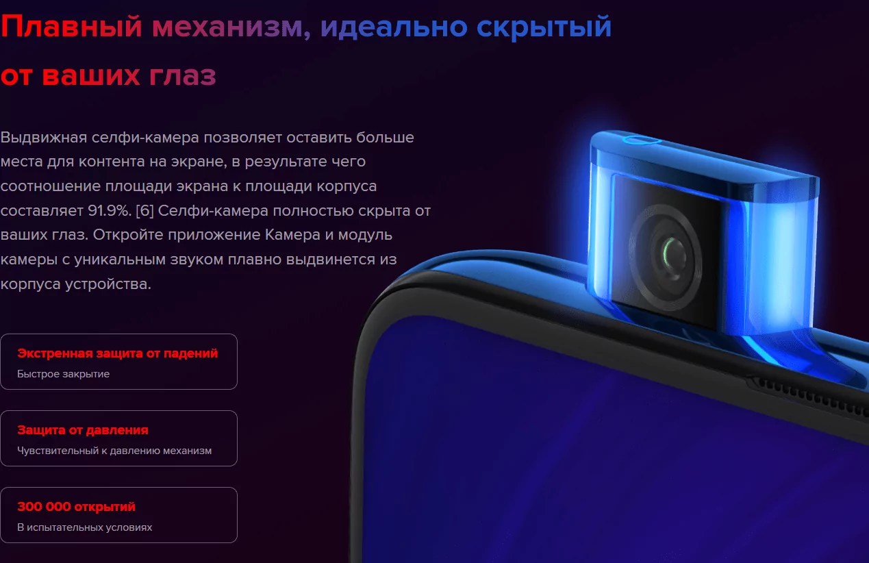 Выдвижная камера на Mi 9T и Mi 9T Pro, согласно данным испытаний Xiaomi, способна появиться и спрятаться более 300000 раз без поломки. Механизм достаточно надёжен, чтобы проработать весь срок эксплуатации смартфона.