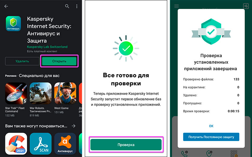 Весьма продуктивным решением является использование специализированных антивирусных утилит из Play Market. Речь идет о Kaspersky, Avast, Norton и других известных антивирусах. Все они обеспечивают полноценную защиту смартфона, своевременно находя угрозы и удаляя вирусы с телефона по факту их обнаружения. Функционал таких программ примерно одинаков. Для старта сканирования системы обычно достаточно нажатия кнопки «Проверка» (или аналогичной).