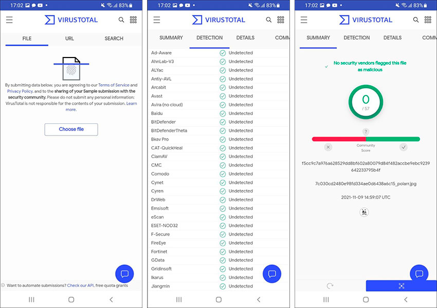 Он очень прост в использовании – просто загрузите файл или вставьте ссылку сайта в VirusTotal, после чего 70 модулей обеспечения кибербезопасности проверят файл или сайт и предоставят вам информацию о наличии угроз.