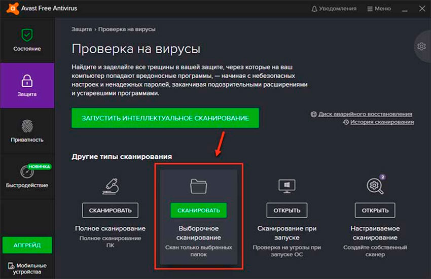 - Нажать на активную строку, предлагающую выбрать объекты для проверки. Отметить все каталоги, включая системные разделы (диски D, E).