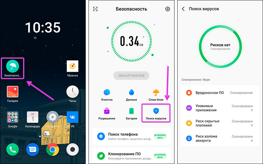 Многие производители устанавливают на смартфоны собственную защиту, предназначенную для удаления вирусов и выполнения ряда других функций, повышающих безопасность эксплуатации смартфонов. Наименование таких защитных опций отличаются. Они могут называться «Очистка», «Безопасность», «Антивирус» и т.д.