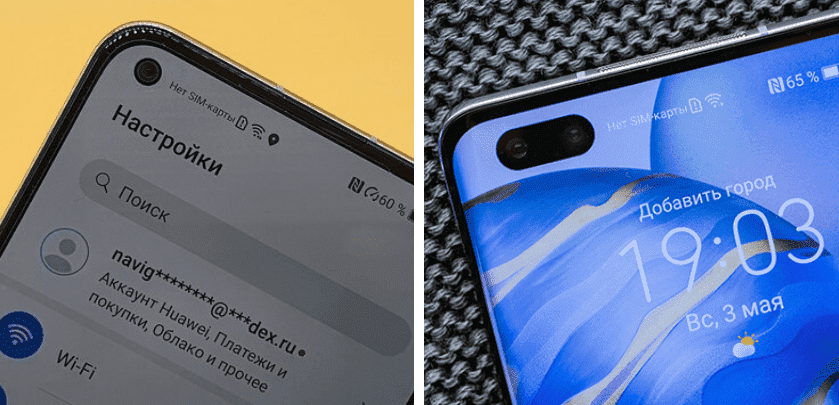 В левом верхнем углу экранов этих телефонов имеются вырезы под фронтальную камеру. У Honor 30 это — небольшое круглое отверстие под один модуль фронталки. У более совершенной модели — продолговатый вырез под камеру с двумя модулями. Этот вырез находится на уровне строки уведомлений и порой скрывает под собой часть выводимой информации.