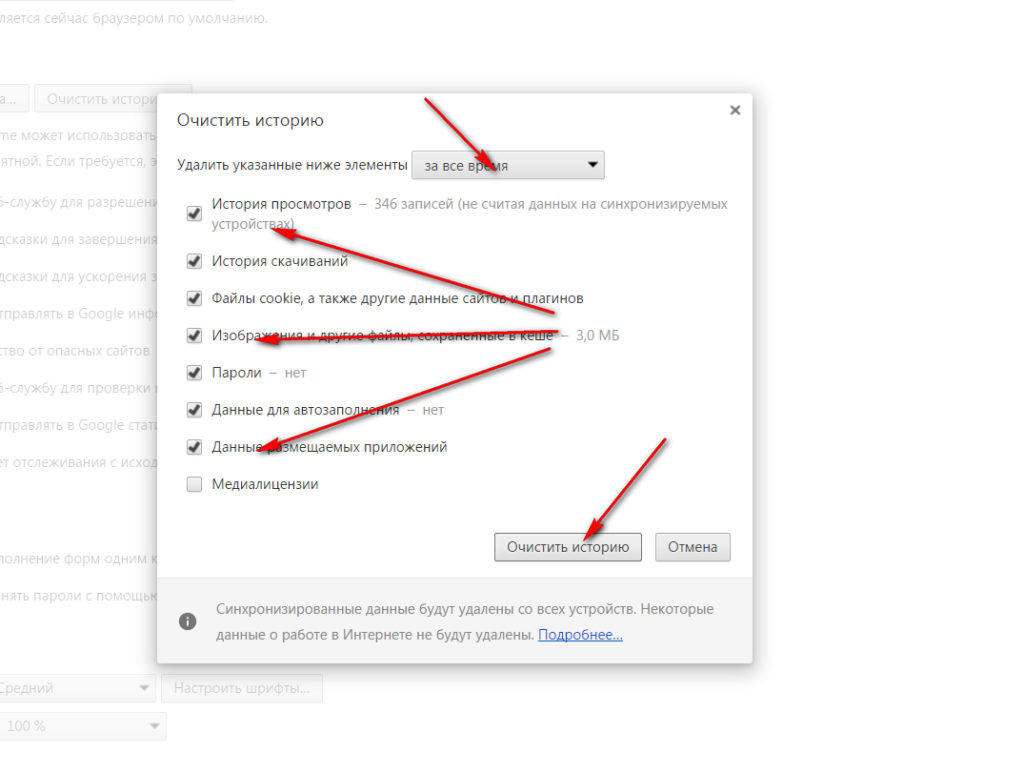 Далее в открывшемся окне выбираем все необходимые пункты (какие именно файлы и за какое время нужно удалить) и нажимаем на «Очистить историю».