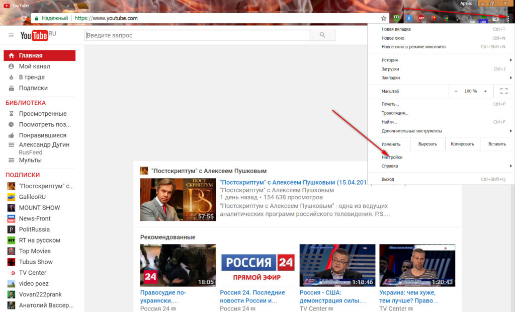 Заходим в настройки браузера и далее в открывшемся окошке кликаем по пункту «Настройки»