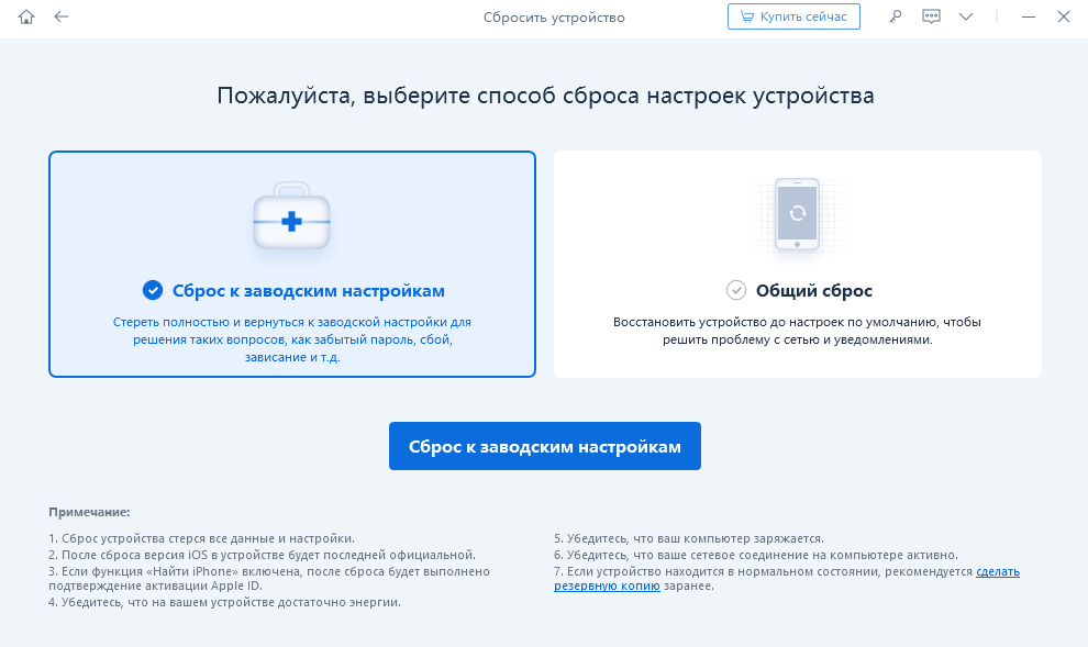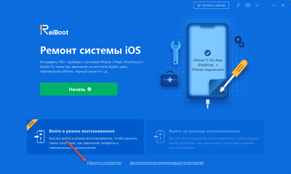 ReiBoot в полуавтоматическом режиме исправляет ошибки, обнаруженные в работе операционных систем iOS, iPadOS и WatchOS, а также по запросу сбрасывает настройки, в том числе и в режиме Recovery. Перед очисткой iPhone достаточно выбрать пункт «Сбросить», расположенный в нижней части пользовательского интерфейса, а затем выбрать наиболее подходящий сценарий.