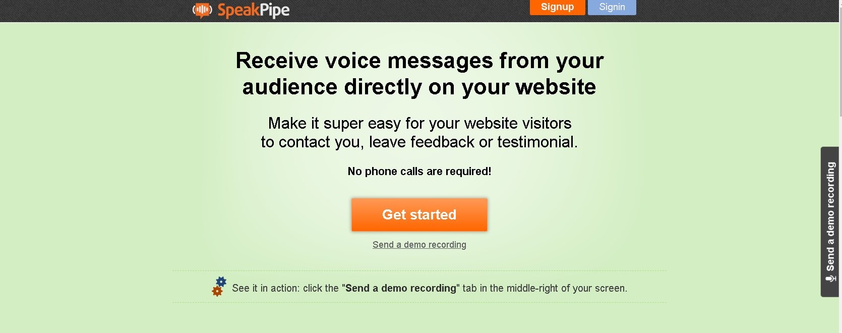 Еще один полезный онлайн-ресурс для проверки микрофона это Speakpipe.com. Хотя он не имеет русскоязычного интерфейса, работать с ним достаточно просто. Чтобы начать тестирование нужно нажать кнопку «Get started» и разрешить приложению использовать микрофон. Для окончания тестирования нажмите «Stop». В результате работы создается аудиофайл, который можно прослушать или послать по электронной почте. Для отправки файла нужно нажать на кнопку «Send a demo recording».