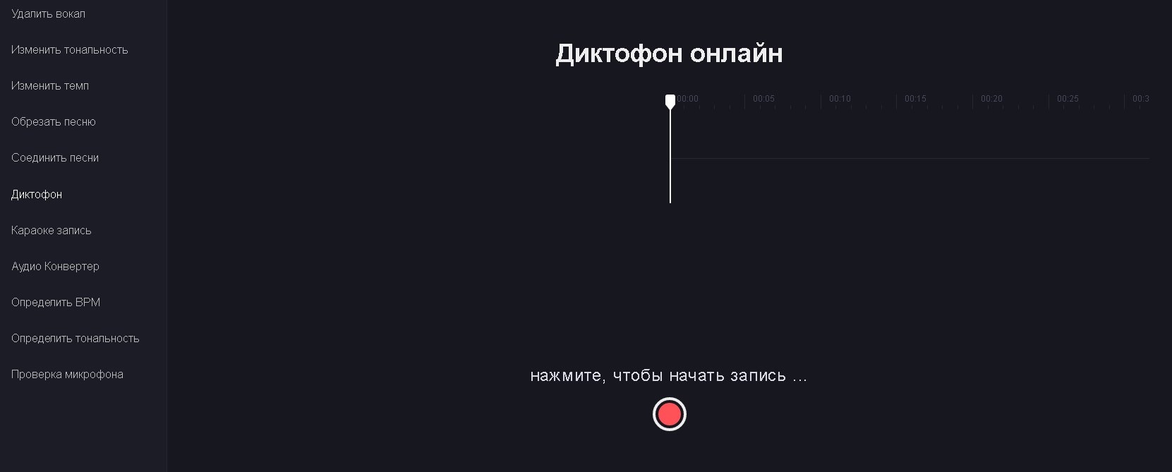 Большие возможности по проверке аудиоустройств, а также записи и редактированию звуковых файлов предоставляет сайт Vocal Remover. Чтобы убедиться в работоспособности устройства для записи звука нужно выбрать в левом меню раздел «Диктофон», разрешить сервису использовать микрофон и нажать кнопку начала записи. Кроме этого данный ресурс можно использовать как караоке, обрезать запись, воспользоваться возможностями эквалайзера. Существует возможность включить шумоподавление, автоматическую регулировку громкости или эффект эха. По окончании работы запись сохраняется. Кликнув по меню «Проверка микрофона» можно посмотреть свойства используемого устройства звукозаписи.
