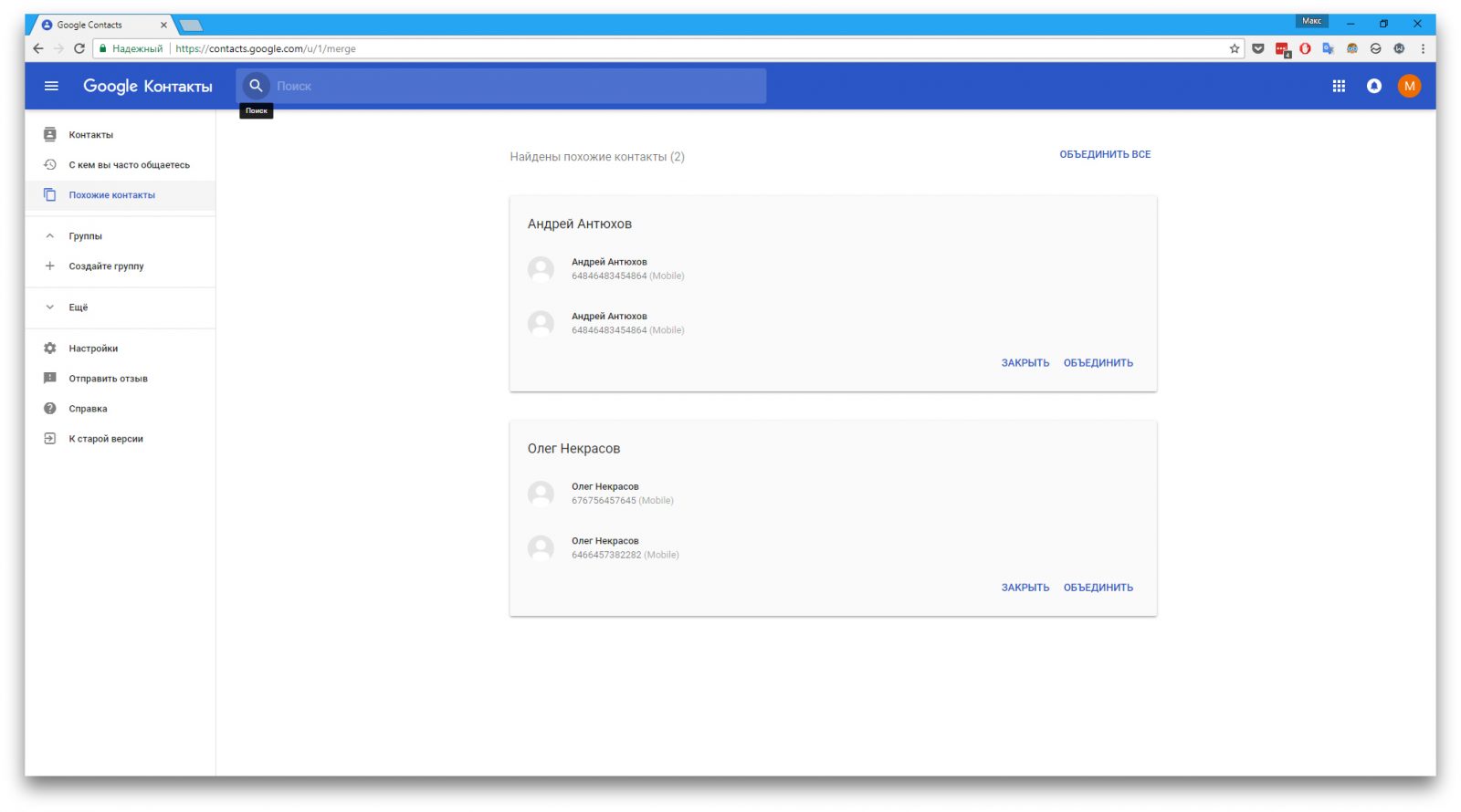 На панели слева выберите «Похожие контакты» и кликните «Объединить» под найденными дублями.