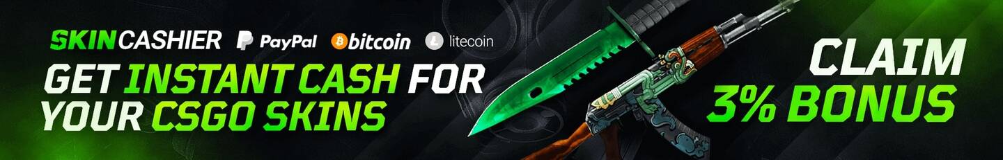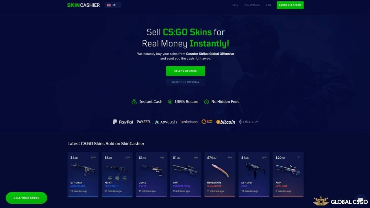 SkinCashier is a site that will buy your skins from CS:GO, Dota2 and Team Fortress 2 and instantly pay the money to your account using the most popular payment processors. It looks like this: after logging into the site you will see your inventory, and then next to each item you will see the price for which Skincashier will buy your skin. Price rates on the site are the best of all. They are not always high, because there are many factors affecting the price of the skin, but considering that we have the money in a minute, it is a very good deal.