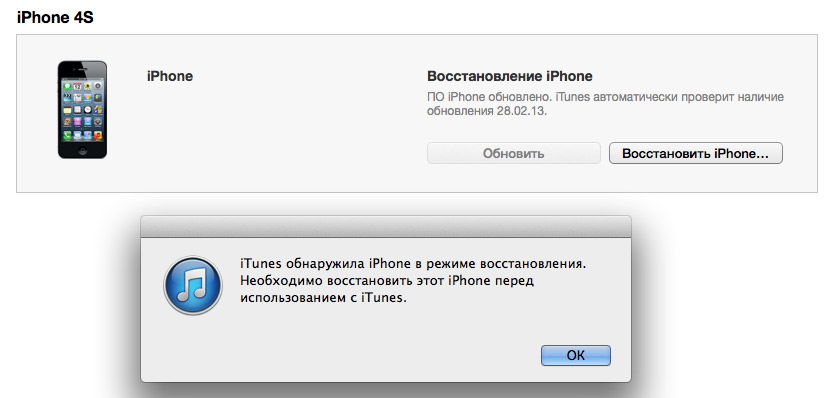 Итак, сначала необходимо подключиться к зарядке на пять-десять минут. Подключившись к компьютеру, проверьте, не обнаружилось ли устройство в iTunes. Если это не произошло, переходите в режим DFU: одновременно удерживайте кнопки «HOME»и «POVER» в течение десяти секунд, после отпустите «POVER». Далее на протяжении пятнадцати-тридцати секунд держите кнопку «HOME», пока iTunes не напишет «Recovery Mode». Не ожидайте далее, что экран отблагодарит вас и покажет, как обычно, яблоко. Свидетельство удачного входа в DFU — отсутствие какого-либо изображения на экране. При желании восстановить прошивку в Айфоне, найдите в iTunes кнопку «Восстановить iPhone». Чтобы завершить работу в этом режиме, просто отсоедините кабель от устройства и на десять секунд нажмите «HOME» и «POVER». После этих манипуляций Айфон должен перезагрузиться.