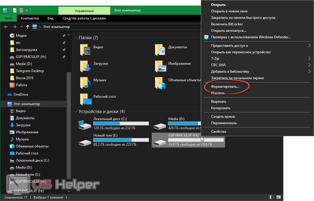- В проводнике кликнуть по флешке ПКМ, а затем в контекстном меню выбрать пункт, отвечающий за форматирование.