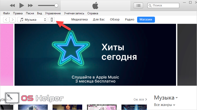 - Подключите iPhone USB-кабелем к компьютеру и откройте iTunes. Нажмите на пиктограмму с изображением телефона.