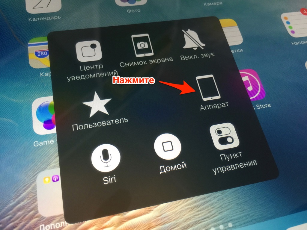 Запустите панель Asisstive Touch, затем нажмите на пункт “Аппарат”