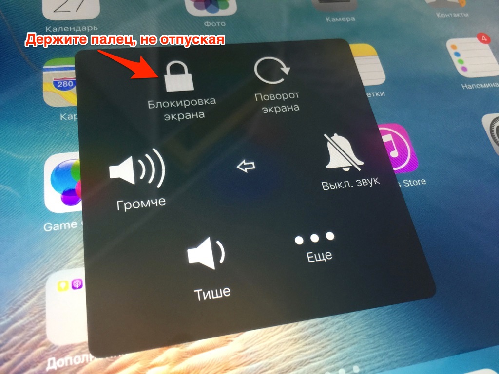 Найти на экране полупрозрачную кнопку меню Assistive Touch и нажать на нее; Откроется меню выбора команд, в котором следует нажать на подпункт «Аппарат»; Далее зажмите на несколько секунд кнопку «Блокировка экрана», после чего появится стандартный экран выключения устройства, где необходимо провести по указанной зоне слева направо.