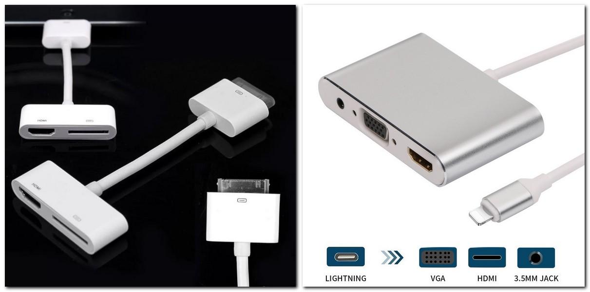 Виды переходников для подключения iPhone к различным типам устройств вывода (справа есть VGA для аналоговых мониторов ПК). Вместе с HDMI у адаптера можно увидеть еще один свободный разъем как у Айфона. Его можно использовать для подключения наушников или включить зарядку.