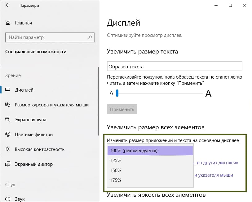 Если Вы сделали текст больше, но Вам все еще трудно видеть что-то на экране, Вы можете попробовать увеличить размер всех элементов. Этот вариант увеличит все в пользовательском интерфейсе, включая текст, шрифты и приложения. Он включает в себя UWP (универсальная платформа Windows) и настольные приложения.