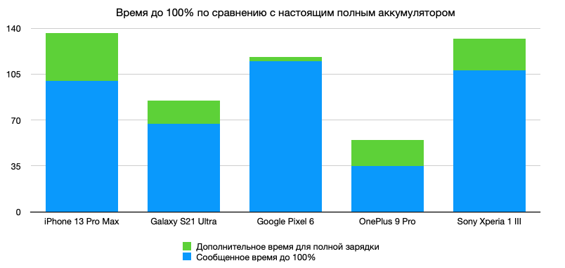 Например, Samsung Galaxy S21 Ultra дошел до 100% примерно за 67 минут, но на самом деле продолжал потреблять энергию еще 18 минут. Хуже был Apple iPhone 13 Pro Max, которому потребовалось и без того довольно долгих 100 минут, чтобы полностью зарядить аккумулятор, но на самом деле он продолжал заряжаться еще 36 минут, прежде чем полностью заполнить бак. Здесь также был замечен OnePlus 9 Pro. Хотя он показал полную зарядку всего за 35 минут, телефон продолжал заряжаться в течение полных 50 минут. Звучит не так быстро, правда?