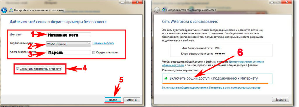 Далее вводим параметры будущей вай фай сети. Имя сети — вписываете любое название. Тип безопасности – можно поставить «WPA2 — Personal». Ключ безопасности — вбиваем пароль и запоминаем его, он понадобиться во время подключения к вашему ноутбуку. Не забываем в самом низу отметить галочкой «Сохранить все параметры». Жмем «Далее». Появиться еще одно окно, где требуется клацнуть на пункте «Включить общий доступ к ….».