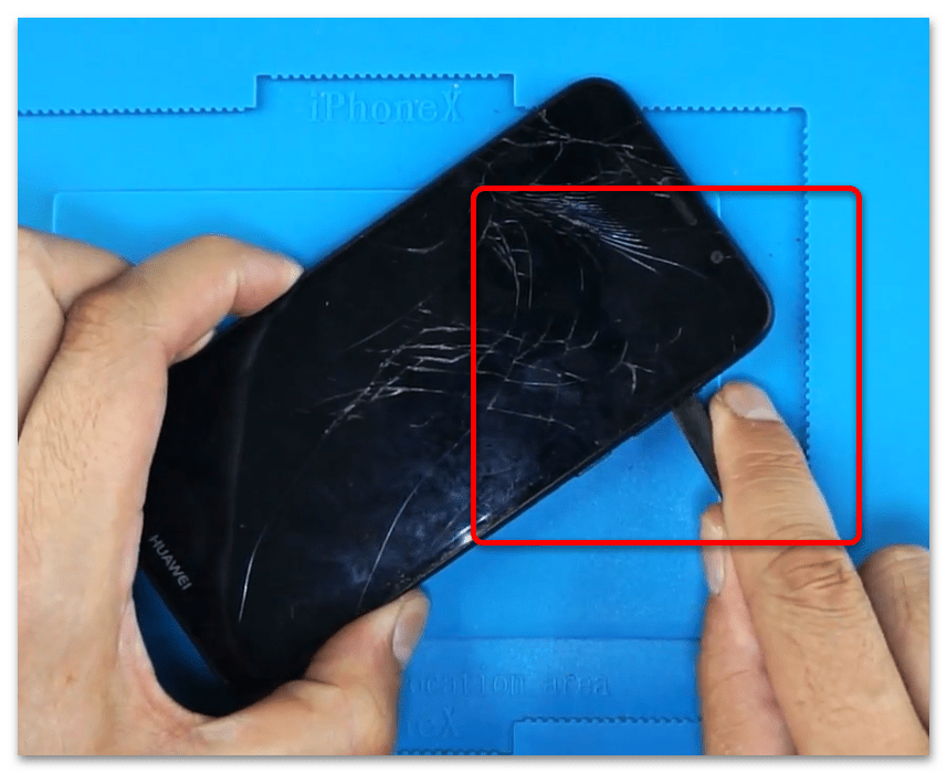 - Далее проводим ногтем последовательно по периметру смартфона, отсоединяя панель. Положительным лакмусом будет лёгкое потрескивание при открытии;