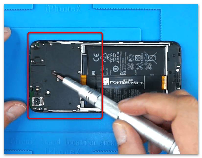Немного поддеваем деталь, указанную на фотографии отверткой, и достаем материнскую плату из корпуса телефона.