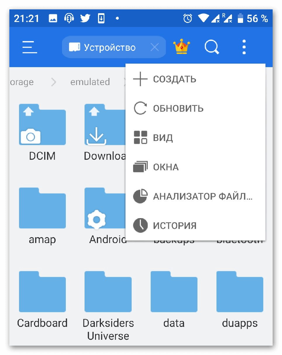 Если необходимо создать папку в памяти Андроида, то используйте для этого файловый менеджер. Подойдет любой – например, ES Проводник, Total Commander, File Manager и т.д. Процесс создания каталога реализован в них одинаково: