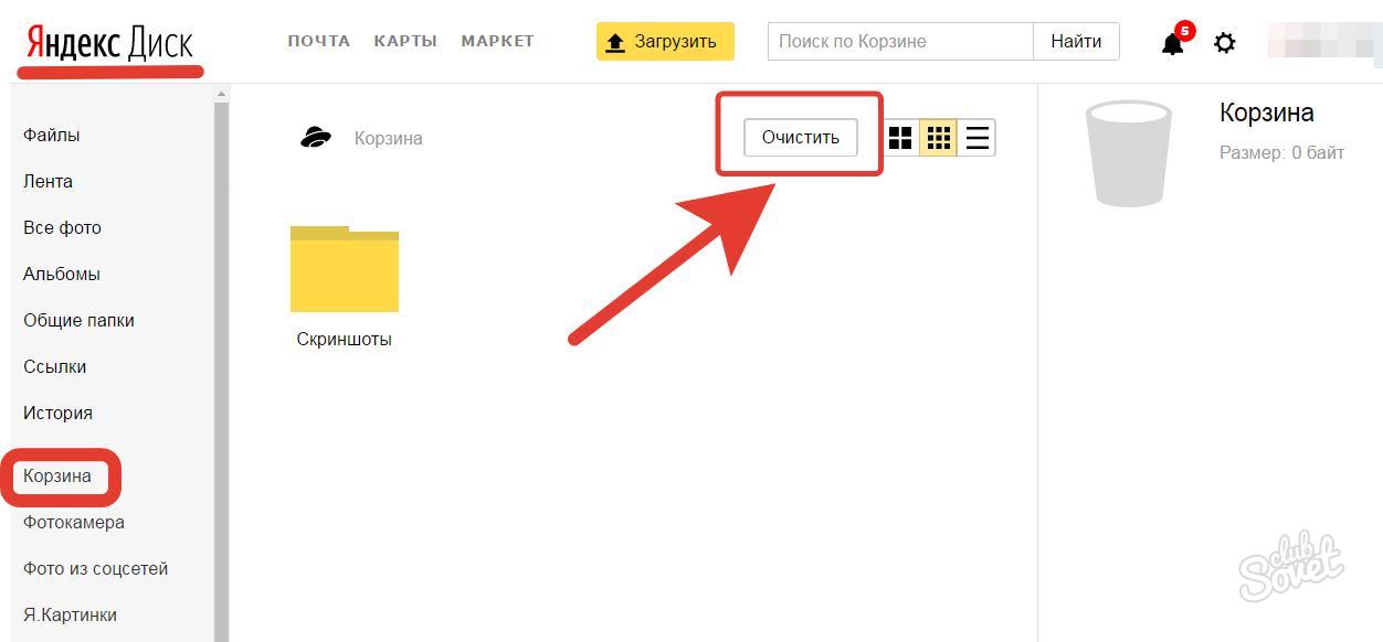 Затем откройте вкладку «Корзина» и очистите ее. Так все файлы будут удалены с интернет-сервиса.