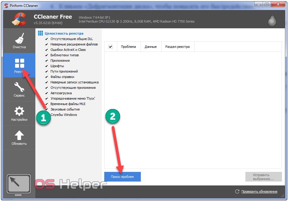 Дальнейшее ускорение работы Windows 7 заключается в чистке реестра. Многие программы и драйверы оставляют после своей деинсталляции ключи (записи) в системной базе данных. Если хотите ускорить ноутбук, от таких ключей следует избавиться. Увы, но инструменты и настройки Windows 7 не предусматривают очистку системного реестра, поэтому на помощь придёт программа по оптимизации ОС, такая как CCleaner. Это лучшая утилита для удаления ненужных записей реестра и временных файлов в Windows.