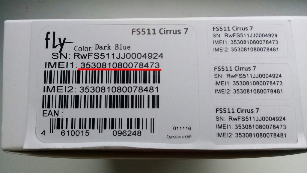 Универсальный способ, как узнать IMEI код телефона – это его просмотр на заводской коробке гаджета. На боковой части бокса производитель клеит специальные штрих-коды с указанием нужного нам идентификатора. На рисунке ниже указан IMEI смартфона Fly.