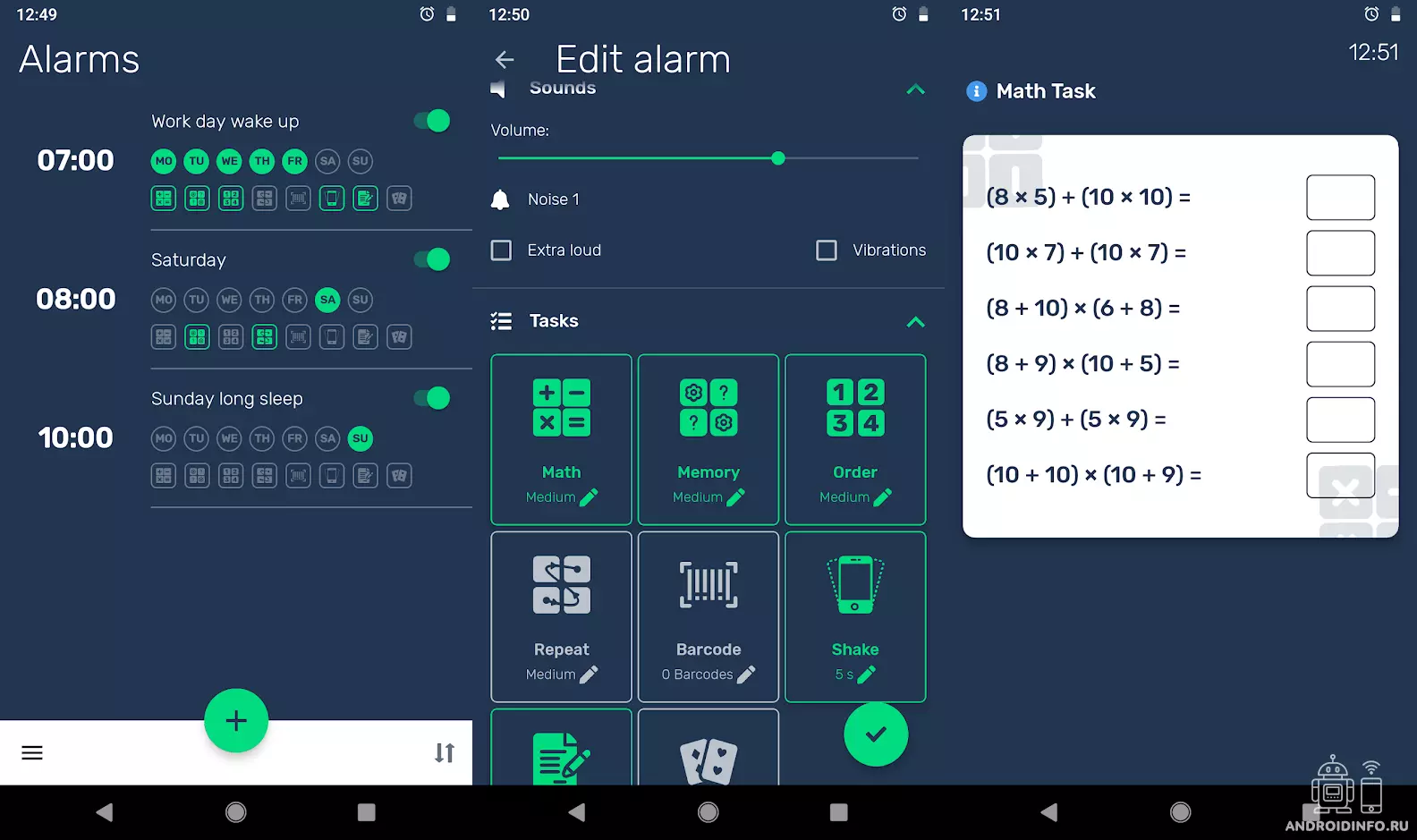 На очереди ещё одно приложение, которое также призвано заменить стандартный будильник на вашем мобильном устройстве. Ключевой особенностью программы является возможность выбора одной из восьми уникальных задач, которую придётся выполнить для того, чтобы отключить надоедливую мелодию. Если же вы не верите в то, что вас способно привести в чувство одно задание – поставьте на важный будильник сразу два, четыре или восемь испытаний, которые гарантированно помогут проснуться и не пропустить запланированное мероприятие. Решайте математические уравнения, находите карточки одинакового цвета, запоминайте и повторяйте последовательности, переписывайте случайно сгенерированный текст, или просто трясите смартфон – делайте всё, что от вас потребуется, для того, чтобы окончательно отвлечься ото сна.