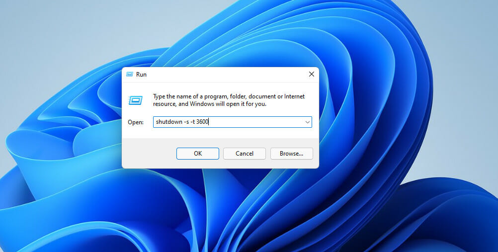 Введите следующую команду таймера выключения в поле Открыть :shutdown -s -t XXXX