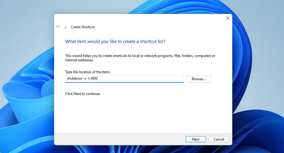 Затем введите команду таймера выключения в поле расположения элемента: shutdown -s -t XXXX